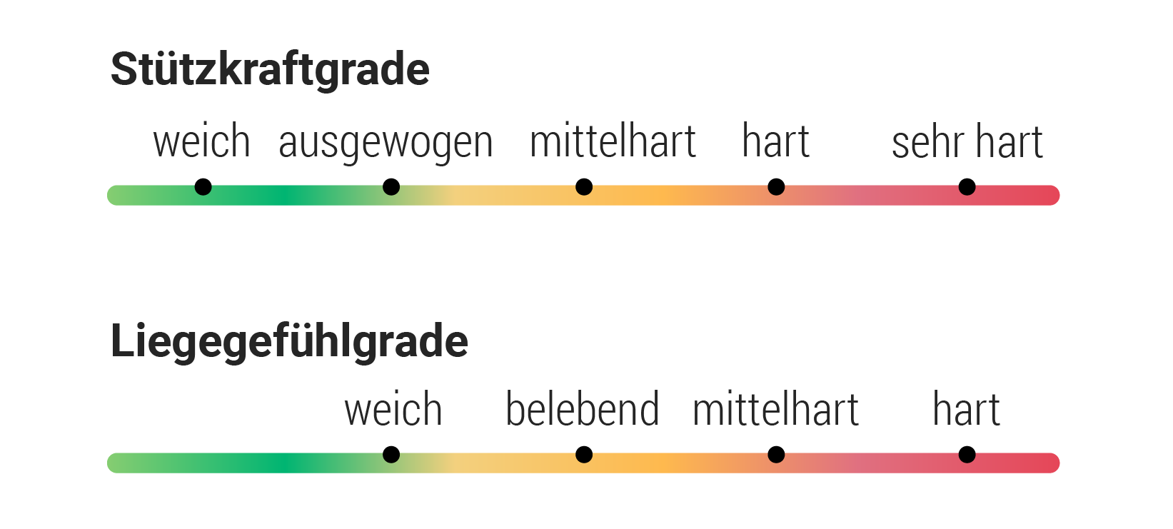- Liegegefühl = Komfort der Matratzenoberfläche (mit Abstufungen von weich bis fest).