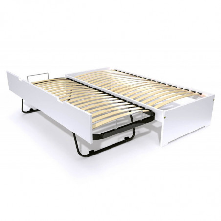 Dank des automatischen Öffnungssystems der Füße lässt sich das untere Bett mit einem Handgriff hochklappen und mit dem Hauptschlafplatz in eine Linie bringen. In wenigen Sekunden verwandelt sich das ausziehbares bett in ein geräumiges Doppelbett von 160x200 cm oder in zwei unabhängige Einzelbetten von 80x200 cm. Dank seiner integrierten Rollen lässt es sich leicht verschieben und nach Lust und Laune aufstellen.