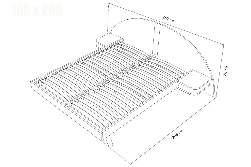 Das holzbett 160x200 ARC wurde mit integrierten Nachttischchen entworfen - ein innovatives Merkmal, das es Ihnen ermöglicht, Ihre wichtigsten Dinge griffbereit zu haben, ohne Ihren Raum zu überfüllen. Sein Multiplex-Lattenrost, der aus 36 Massivholzlatten besteht, sorgt für eine gleichmäßige und komfortable Unterstützung und somit für eine bessere Schlafqualität. Darüber hinaus verstärkt ein Mittelfuß die Stabilität das holzbett 160x200 und garantiert eine solide und stabile Basis für dauerhaften Komfort.
