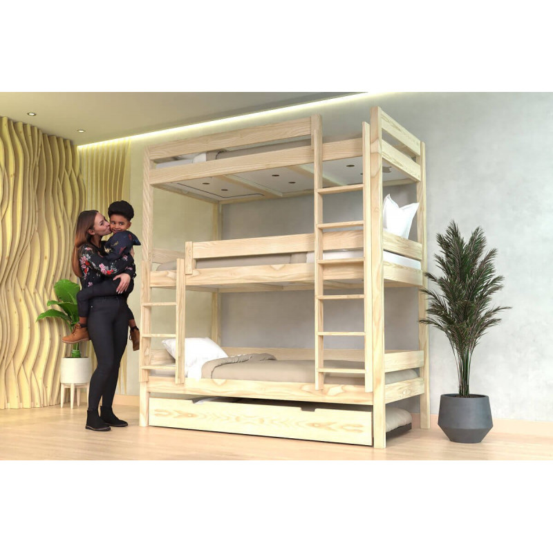 Mit seinen drei festen Schlafplätzen (90x190 cm) und dem vierten Schlafplatz in Form eines Schubladenbetts ist das 4-sitzige Etagenbett ABC so konzipiert, dass es den Raum auf bemerkenswerte Weise optimiert. Dieses Modell eignet sich perfekt für Schlafzimmer oder Mehrzweckräume und bietet eine elegante und funktionelle Lösung für mehrere Schlafplätze.