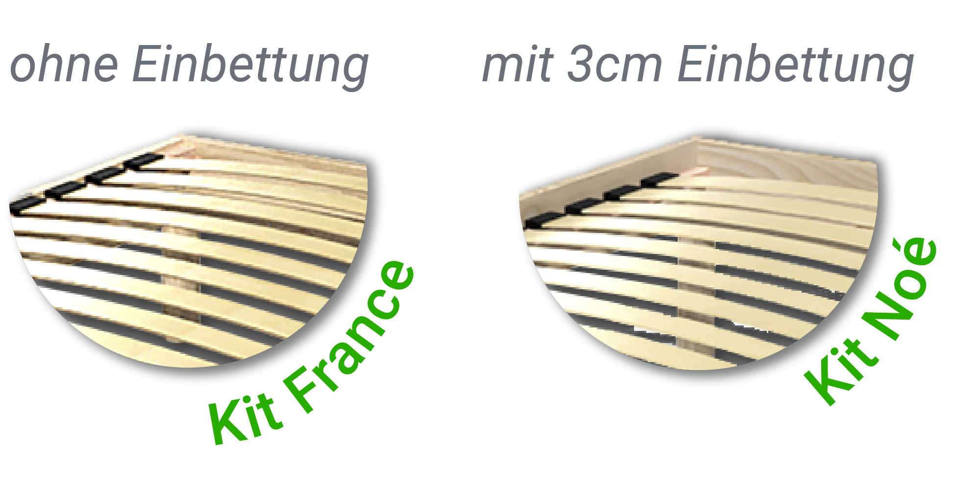 Die Wahl zwischen diesen beiden Optionen hängt von Ihren Vorlieben und der Art des Bettrahmens ab, den Sie verwenden. Die meisten unserer Lattenroste sind mit Einbettung, außer die folgenden Modelle: Kit France, Twin