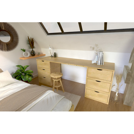 En algunos acabados, como el inacabado y el barniz natural, observará que algunas piezas de madera están ensambladas a dedo. La base de los cubos y el fondo de los cajones de nuestro escritorio madera natural son de isorel blanco/marrón. Los cajones están equipados con guías metálicas que garantizan un movimiento suave y duradero cada vez que se utilizan.