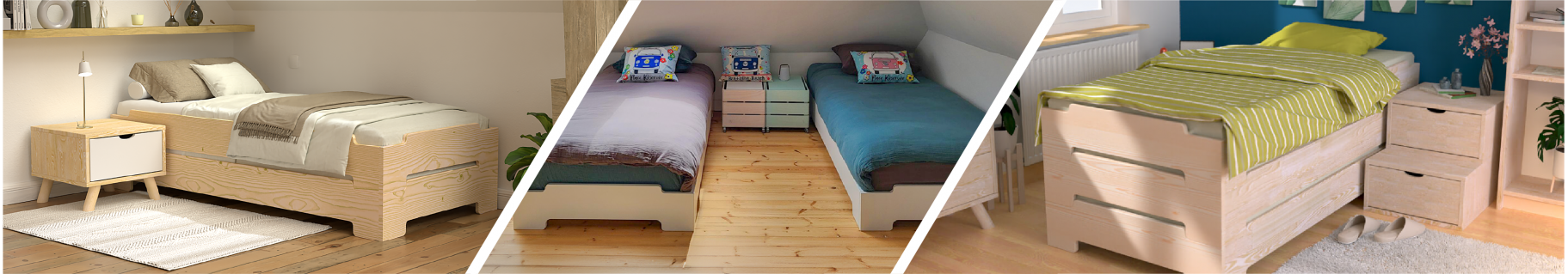 Una cama apilable es una cama individual de madera diseñada para ser apilada sobre otra u otras camas del mismo modelo. A diferencia de las literas, no todas las posiciones para dormir son accesibles en posición apilada: sólo se puede utilizar la posición para dormir superior cuando están apiladas. Pueden separarse en un abrir y cerrar de ojos e instalarse una al lado de la otra, o en habitaciones separadas, según las necesidades. Esta modularidad las convierte en la opción ideal para familias, alquileres vacacionales, pensiones y pisos pequeños.