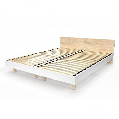 Esta cama gemela se compone de dos somieres de tamaño estándar (17 lamas cada uno) y de cabeceros de 22 mm de grosor + 1 soporte de pie.