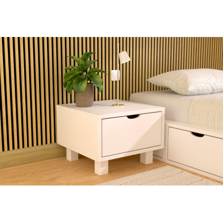 Pour certaines finitions, comme le brut et le vernis naturel, vous remarquerez que certaines pièces en bois son aboutées. Le fond des cubes et la partie inférieure des tiroirs, de notre chevet de lit, sont réalisés en isorel marron/blanc. Les tiroirs sont équipés de glissières métalliques, assurant un mouvement fluide et durable à chaque utilisation.
