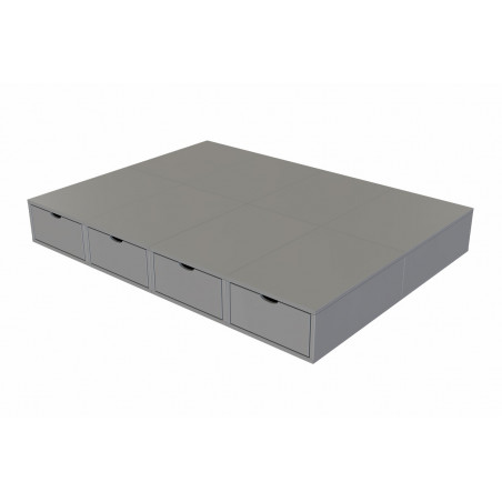 Pour certaines finitions, comme le brut et le vernis naturel, vous remarquerez que certaines pièces en bois son aboutées, sur notre lit double avec rangement. Le fond des cubes et la partie inférieure des tiroirs, de notre lit avec tiroirs, sont réalisés en isorel (1 face blanche et 1 face marron). Les tiroirs sont équipés de glissières métalliques, assurant un mouvement fluide et durable à chaque utilisation.