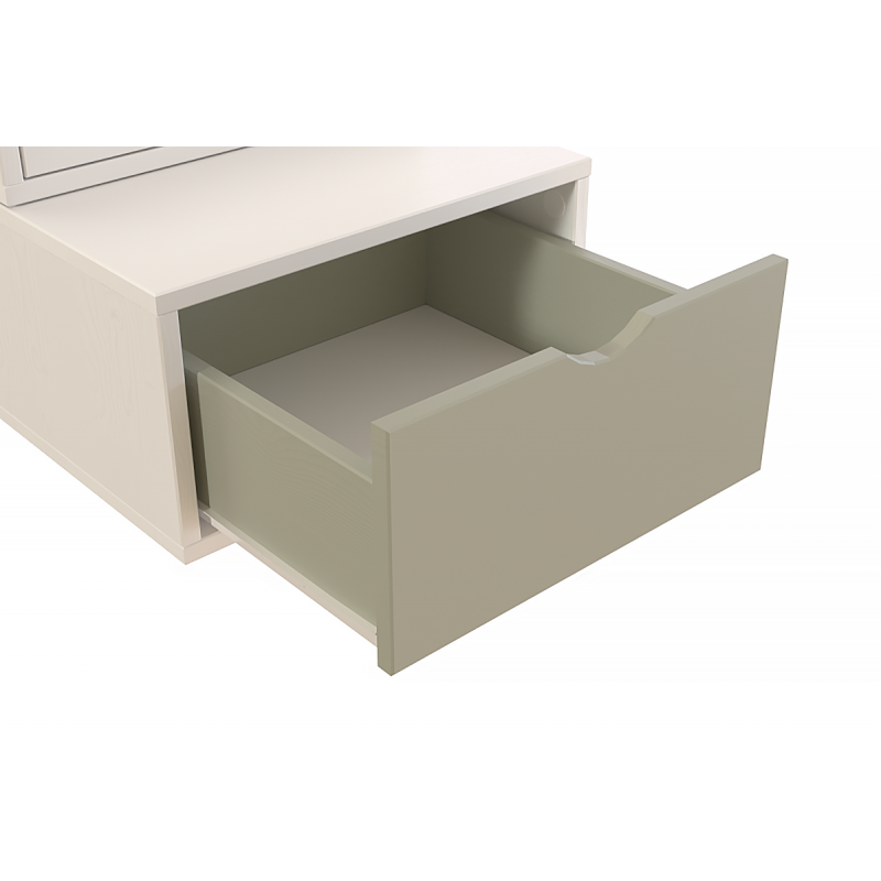 Some wooden parts are finger-jointed (visible on raw and natural varnish finishes). The base of the cubes and the underside of the drawers, of the staircase with storage, are in isorel (1 white side & 1 brown side). Drawers on metal runners.