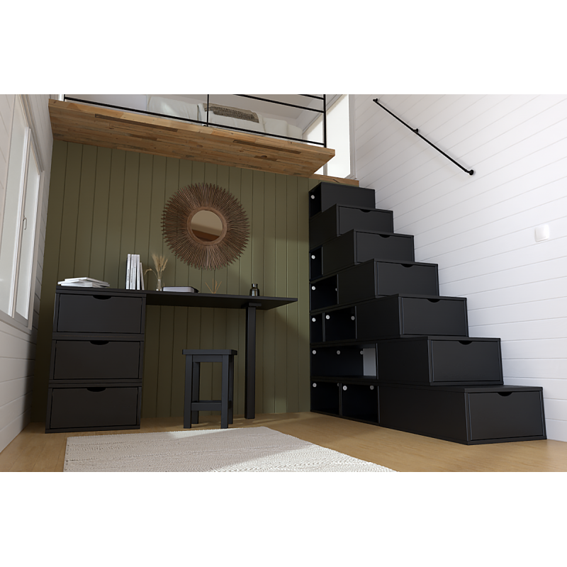 Discover our 175cm stairs as storage, a bold and stylish way to save space in your home. This piece of furniture can be used as a room divider, a conventional staircase, a bookshelf staircase or a storage solution, offering unparalleled adaptability in its use.