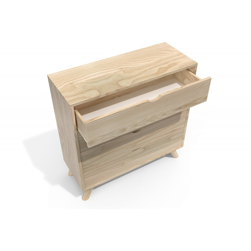 Some of the wooden parts are finger-jointed (visible on raw and natural varnish finishes). The bottoms of the drawers and the chest of drawers are in isorel. Drawers on metal runners.