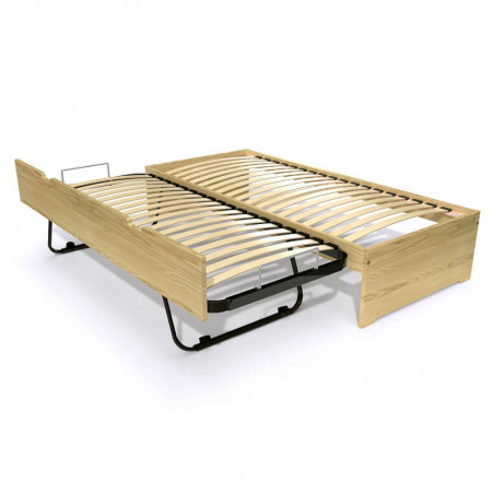 The main slatted base, with 18 multi-ply slats, ensures that the mattress is well supported for a restful night's sleep. As for the lower bed, its metal structure with 20 slats guarantees optimum support. Thanks to an automatic raising mechanism, it can easily be aligned with the upper bed, transforming the bed into a large 180x200 cm berth or two independent 90x200 cm single beds. Mounted on castors, it's effortless to move around, so you can set it up quickly and easily.