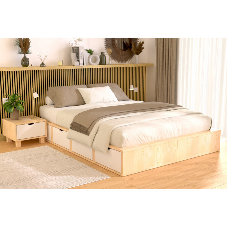 Per alcune finiture, come il grezzo e la vernice naturale, noterete che alcune parti del legno sono giuntate a pettine, come nel il nostro letto matrimoniale con contenitore. La base dei cubi e la parte inferiore dei cassetti del nostro letto con cassetti sono in isorel (1 lato bianco e 1 lato marrone). I cassetti sono dotati di guide metalliche che garantiscono un movimento fluido e duraturo ad ogni utilizzo.