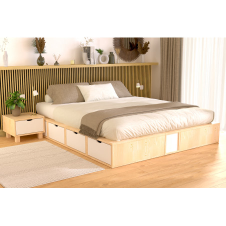 Il nostro letto matrimoniale con contenitore è disponibile in 6 colori a tinta unita (grezzo, vernice naturale, miele, bianco, nero e grigio). Variate il piacere con la finitura bicolore (vernice naturale/bianco).