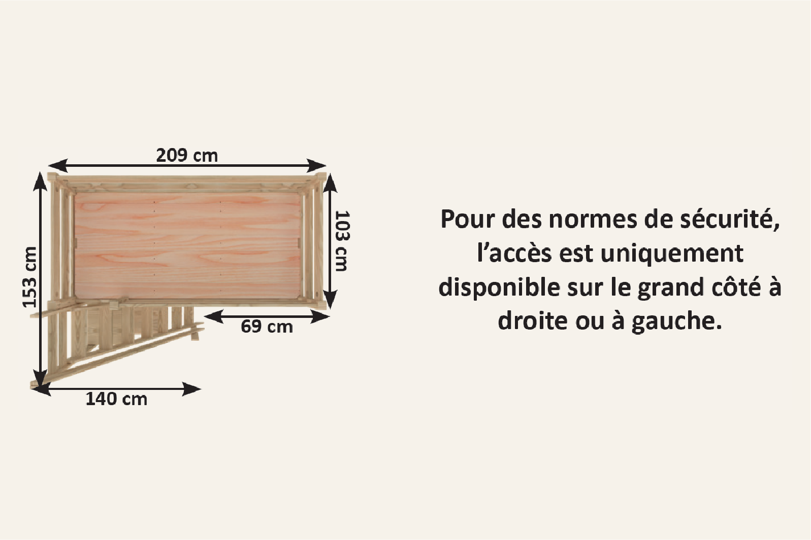 Il nostro letto a soppalco Sylvia a 1 posto offre altre opzioni di accesso: scala inclinata o scala a cubo, a seconda delle vostre preferenze e della disposizione della vostra camera da letto. Per questo modello, l'accesso è esclusivamente sul lato lungo, a destra o a sinistra. Per quanto riguarda la biancheria da letto, consigliamo il materasso Montana con uno spessore di 18 cm per un comfort ottimale. Per garantire una distanza minima di 16 cm tra la parte superiore del materasso e la sponda superiore (per motivi di sicurezza), si ricorda che il materasso non deve avere uno spessore superiore a 22 cm.