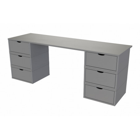 Per alcune finiture, come il grezzo e la vernice naturale, noterete che alcune parti del legno sono giuntate a pettine, sulla nostra scrivania legno. La base dei cubi e il fondo dei cassetti della nostra grande scrivania moderna in legno sono realizzati in isorel bianco/marrone. I cassetti sono dotati di guide metalliche che garantiscono un movimento fluido e duraturo ad ogni utilizzo.